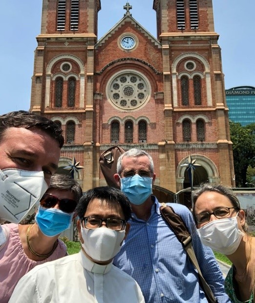 L’équipe chargée de l’animation liturgique et Frère Joseph devant la cathédrale de Saïgon