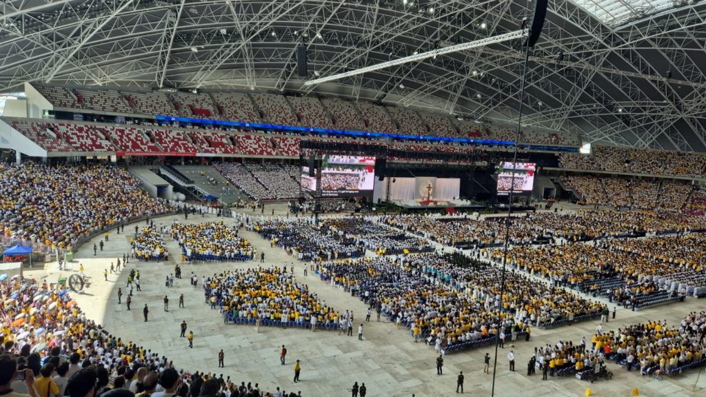 Avec ses 280 prêtres (dont notre aumônier de la CCFS), 300 servants de messe, 1600 choristes et 50 000 fidèles venus de Singapour et des pays voisins… la célébration au Stadium s’annonçait grandiose. À l’unanimité, tout ceux qui ont pu y participer ont été marqués par son organisation sans faille et l’immense ferveur qui s’en dégageait. Quelle émouvante image de l’église universelle ! Un stade rempli de fidèles joyeux, souriants, tous vêtus de jaune et blanc aux couleurs du Vatican, ou vêtus de leurs plus beaux costumes traditionnels (malais, vietnamiens, thaïlandais, philippins…). L’ensemble composait une magnifique mosaïque d’âges, de visages, de cultures.