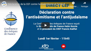 Pour la première fois, le Conseil permanent de la Conférence des évêques de France (CEF) a reçu, lundi 1er février 2021, pour un temps de travail suivi de la remise solennelle de la déclaration « Lutter ensemble contre l’antisémitisme et l’antijudaïsme sera la pierre de touche de toute fraternité réelle », le Grand Rabbin de France, Monsieur Haïm Korsia et le Président du CRIF (Conseil représentatif des institutions juives de France), Monsieur Francis Kalifat.